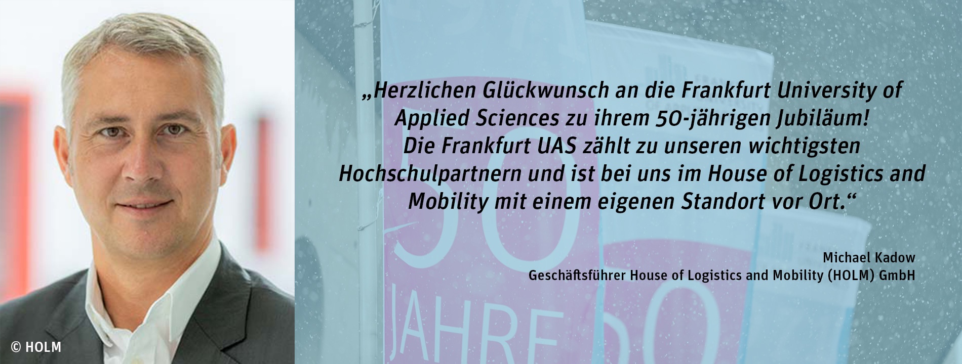 „Unsere Hochschule wird 50 – ein stolzes Alter. Seit 1971 stehen wir für praxisorientierte Lehre und Forschung hier im Rhein-Main-Gebiet. Wir können stolz darauf sein, was wir schon alles erreicht haben: Mit fast 16.000 Studierenden sind wir eine der größten Hochschulen für Angewandte Wissenschaften in Deutschland. Wir sind forschungsstark, regional wie international hervorragend vernetzt und ein treibender Motor für nachhaltige Entwicklung. Seit 50 Jahren leben wir ‚Chancen durch Bildung‘ – vor allem in der Lehre und der Weiterbildung. Auch in der Forschung hat uns unser interdisziplinärer Ansatz zu einem innovativen Entwicklungspartner für die vielfältigen Organisationen unserer Gesellschaft gemacht. Das wollen wir in diesem Jubiläumsjahr gemeinsam mit Ihnen feiern!“