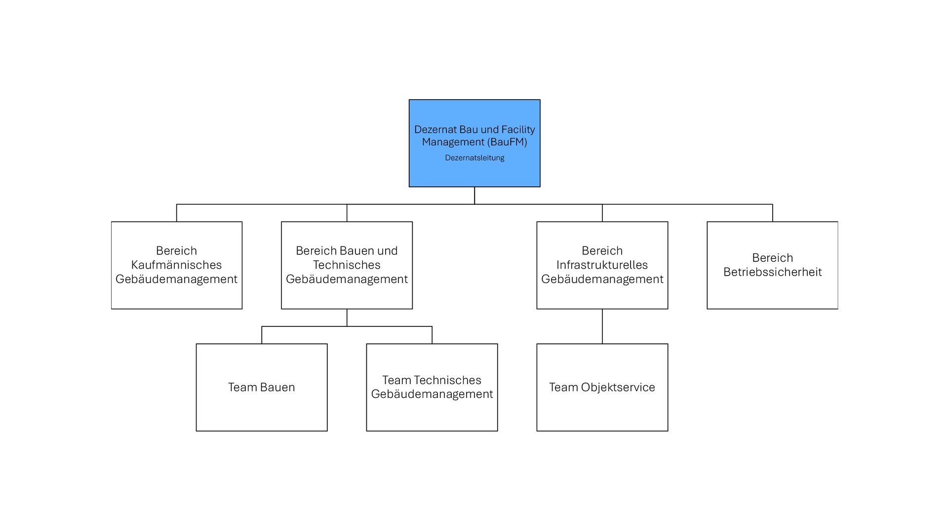 Das Dezernat "Dezernat Bau und Facility Management (BauFM)" ist in vier Bereiche unterteilt.