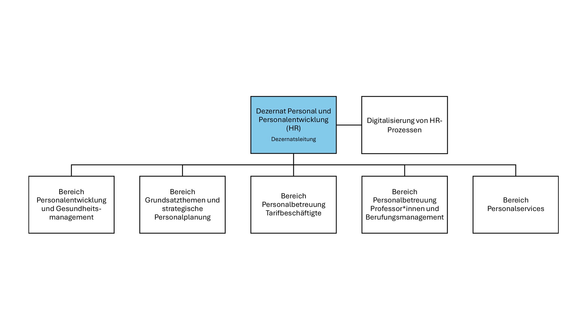 Das Dezernat "Personal und Personalentwicklung (HR)" ist in fünf Bereiche unterteilt.