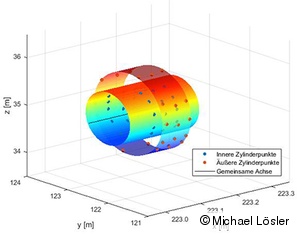 Die aus der Ausgleichung stammenden Koordinaten wurden zum Ableiten von Formparametern unter Berücksichtigung der vollbesetzten Dispersionsmatrix herangezogen. Bedingt durch das Aufnahmeverfahren des zylindrischen Strahlrohrs zwischen den Kryostatmodulen ergab sich als geometrische Figur ein Doppelzylinder, welcher mit Verfahren der Formanalyse zu bestimmen war. Die Ableitung der Ausrichtung und Neigung der Dipole und Quadrupole erfolgte über Regressionsebenen, wie sie auch bei der Einmessung von Fächerecholoten Anwendung finden. Insgesamt konnte mit einer räumlichen Punktunsicherheit von 0,2 mm (k=2) für die Objektpunkte die o.g. Anforderungen für Einzelpunktpositionen und abgeleitete Größen erfüllt werden.