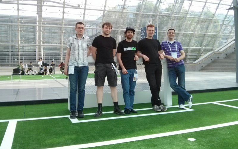 In der ersten Hauptrundengruppe, der Gruppe E mit vier Teams, traf FRA-UNIted auf drei Teams von drei Kontinenten. Während wir gegen das brasilianische Team ITAndroids recht ungefährdet 1:0 gewannen, gelang uns gegen das Team Namira (Iran) ein 7:0-Kantersieg. Im letzten Spiel des Tages verloren wir knapp und etwas unglücklich gegen das japanische Team HillStone mit 2:1. Dank des besseren Torverhältnisses ging FRA-UNIted damit als Sieger aus dieser Gruppe hervor.