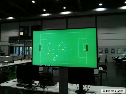 Am heutigen Vorbereitungstag hat unser Team als eines der ersten mit Erfolg seinen Kurztest (1/10 der Spielzeit) absolviert. Hierbei geht es nur darum, die grundsätzliche Lauffähigkeit der fußballspielenden Software-Agenten unter Beweis zu stellen und nachzuweisen, dass FRA-UNIted in der automatisierten Spielumgebung als ganzes Team durch die Offiziellen ohne Probleme gestartet und wieder beendet werden kann.
