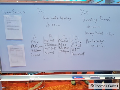 Inzwischen sind die meisten der 20 qualifizierten Teams, die an den Wettkämpfen in der 2D-Simulationsliga teilnehmen werden, eingetroffen. Die verbleibende Zeit wird mit Hochdruck genutzt, um den simulierten Roboterfußballprogrammen den letzten Schliff zu verleihen oder aber strategische Entscheidungen zu treffen, bevor das Turnier am morgigen Donnerstag mit der Vorrunde startet.