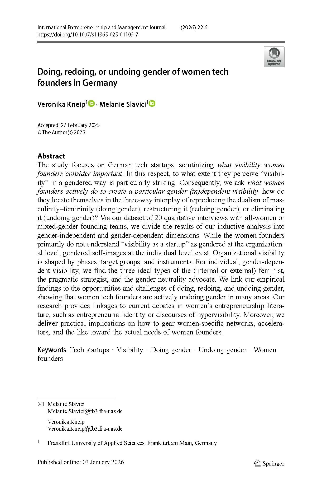 - Kneip, Veronika; Slavici, Melanie (2026): Doing, redoing, or undoing gender of women tech founders in Germany. In: International Entrepreneurship and Management Journal. DOI: 10.1007/s11365-025-01103-7.