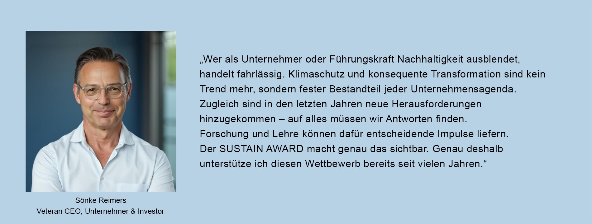 Der Sustain Award der Frankfurter Stiftung für Forschung und Bildung in Zusammenarbeit mit der Frankfurt University of Applied Sciences und mit freundlicher Unterstützung des Förderers Procter & Gamble ist mit einem Preisgeld in Höhe von 4.000 Euro dotiert.