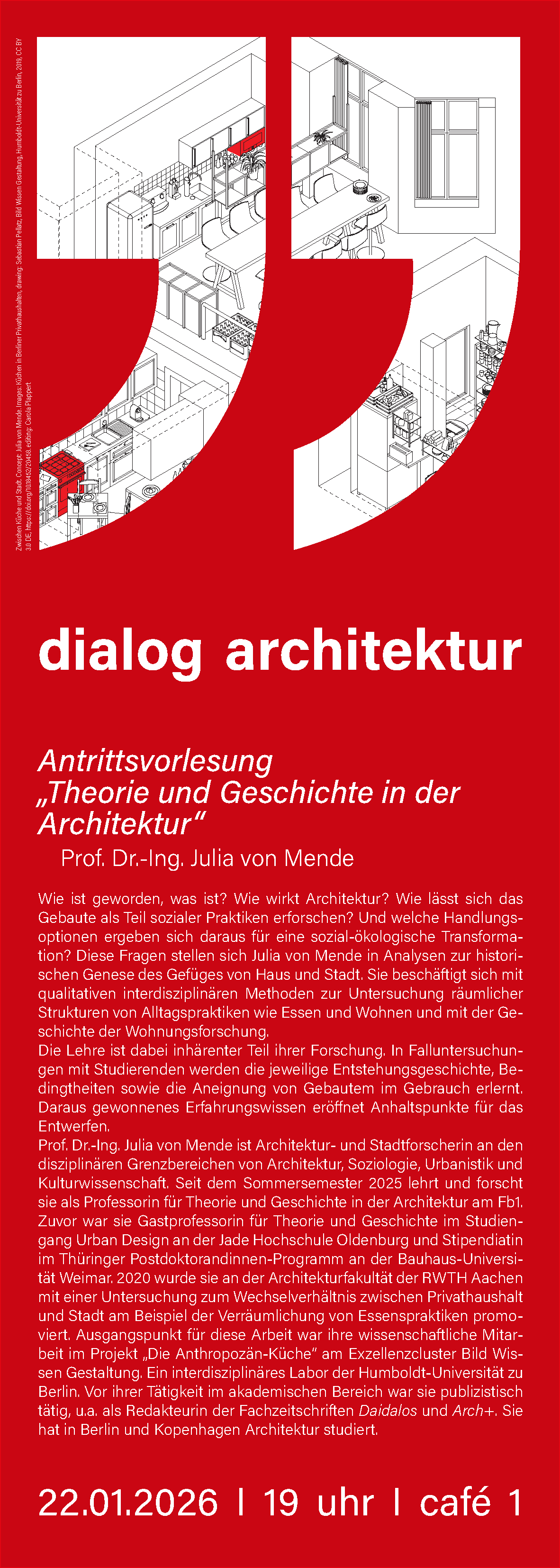Wie ist geworden, was ist? Wie wirkt Architektur? Wie lässt sich das Gebaute als Teil sozialer Praktiken erforschen? Und welche Handlungsoptionen ergeben sich daraus für eine sozial-ökologische Transformation? Diese Fragen stellen sich Julia von Mende in Analysen zur historischen Genese des Gefüges von Haus und Stadt. Sie beschäftigt sich mit qualitativen interdisziplinären Methoden zur Untersuchung räumlicher Strukturen von Alltagspraktiken wie Essen und Wohnen und mit der Geschichte der Wohnungsforschung. Die Lehre ist dabei inhärenter Teil ihrer Forschung. In Falluntersuchungen mit Studierenden wird die jeweilige Entstehungsgeschichte, Bedingtheiten sowie die Aneignung von Gebautem im Gebrauch erlernt. Daraus gewonnenes Erfahrungswissen eröffnet Anhaltspunkte für das Entwerfen.