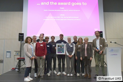 Eine günstige und schützende Behausung für trockene Regionen ganz aus Pilzmyzel – Architektur-Studierende der Frankfurt University of Applied Sciences (Frankfurt UAS) haben im Sommersemester 2025 mit dem „MyGlu“ ein nachhaltiges Baukonzept in Zeiten des Klimawandels erprobt. Das Lehrprojekt von Professor Dr. Florian Mähl, Mitglied des Lehr- und Forschungsnetzwerks ReNewHub am Fachbereich Architektur, Bauingenieurwesen, Geomatik, hat dafür den hochschulweit ausgeschriebenen Sustain Award erhalten. Anfang Oktober 2025 nahm Mähl mit den Studierenden bei einer Gala die Preisurkunde entgegen. Die Auszeichnung ist mit 4.000 Euro dotiert.