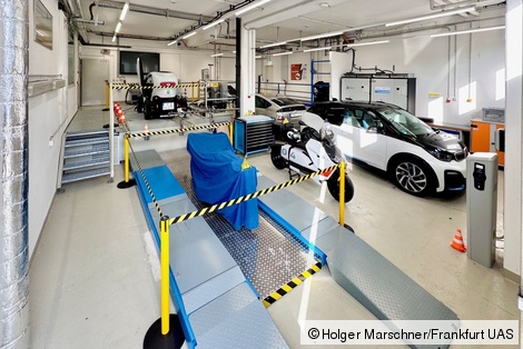 Das E-Mobility-Center mit E-Mobilitätsprüfstand wurde an der Frankfurt UAS im Jahr 2023 eingerichtet und aus Mitteln des Europäischen Fonds für regionale Entwicklung als Teil der Reaktion der Union auf die COVID-19-Pandemie finanziert. Die Einrichtung ergänzt die Ausstattung des bisherigen KFZ-Labors. Herzstück ist ein Allrad-Rollenprüfstand, mit dem sich die Fahrzeug-Achsen elektrisch antreiben und abbremsen lassen. Ergänzt wird er von einer E-Ladeinfrastruktur und einem Trainingssystem für Hochvolt-Technik. Im E-Mobility-Center kann so beispielsweise die Reichweite von E-Fahrzeugen getestet werden und die Rückgewinnung von Energie beim Abbremsen durch Rekuperation. Forschende können im E-Mobility-Center zudem neue Brennstoffzellen- und Batteriekonzepte erproben oder in Langzeitstudien die Lebensdauer von Fahrzeugbatterien untersuchen. Für die Forschung und Lehre im E-Mobility-Center kooperiert die Frankfurt UAS mit verschiedenen Partnern.