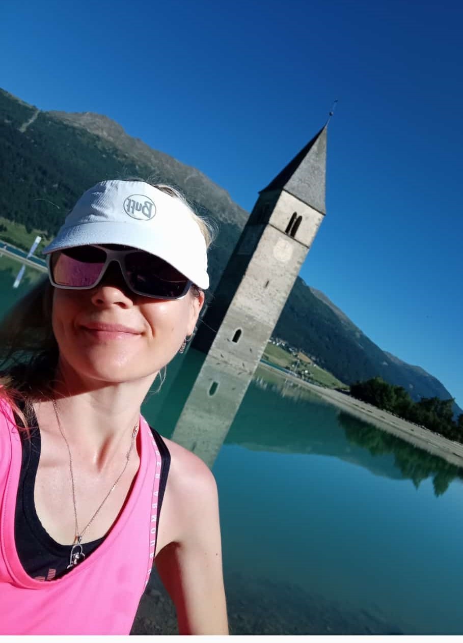 Im Gedächtnis sind mir insbesondere die Laufeinheiten in meinem Urlaub geblieben. Auch wenn es an der Côte d’Azur sehr heiß war, denke ich noch heute sehr gerne an die wundervolle Laufstrecke direkt am Meer zurück oder an Läufe in der Rhön. Zuletzt habe ich meinen Mann nach Nauders zum Dreiländergiro begleitet und bin um den Reschensee gelaufen, während er die 3.500 Höhenmeter mit dem Rennrad erklomm. Dabei ist auch das Selfie entstanden. Die Mischung aus strahlend blauem See, Sonne und schneebedeckten Bergen war wundervoll. Aber auch die Atmosphäre bei Wettkämpfen ist sehr schön, wenn ich gemeinsam mit meinem Papa am Start stehe. Ich bin immer wieder fasziniert, wenn uns fremde Menschen anfeuern, und lerne häufig auch während des Wettkampfes nette Menschen kennen.