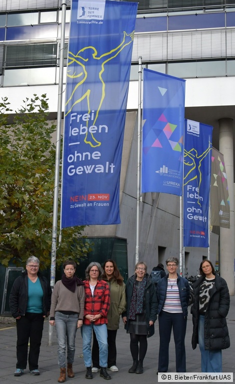 Sie lädt zusammen mit dem Frauenreferat der Stadt Frankfurt als Teil eines breiten Aktionsbündnisses aus mehr als 45 lokalen Initiativen, Vereinen, politischen Parteien und Interessenvertretungen dazu ein, an diesem Tag gemeinsam ein lautstarkes Zeichen der Solidarität zu setzen. Schon jetzt wehen auf ihre Initiative hin auf unserem Campus die blauen Fahnen mit der Aufschrift „Frei leben ohne Gewalt“ von TERRE DES FEMMES - Menschenrechte für die Frau e.V., die ebenfalls auf den Aktionstag aufmerksam machen.
