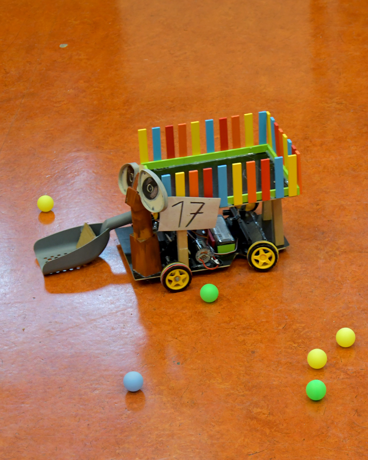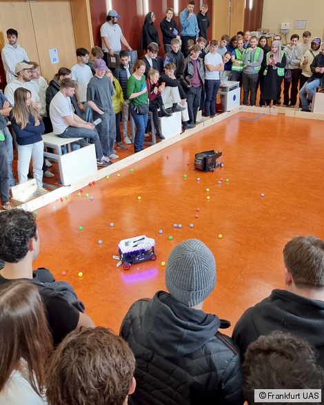 Der Praxistest erfolgte dann beim Abschlusswettbewerb. Die Teams traten gegeneinander auf einem festgelegten Spielfeld an. Ziel war es, die eigenen Bälle aufzunehmen oder zumindest in den eigenen Zielbereich zu bringen. Alles musste dabei tadellos zusammenspielen – das Fahrzeug selbst, die Ballsammeltechnik und die Fahrkünste an der Fernbedienung. Besonders schwierig war dabei, dass bis zu vier Teams gleichzeitig ihre Bälle auf dem Spielfeld aufsammeln sollten. Ohne die eine oder andere Kollisionen und Karambolage war das nur schwer möglich.