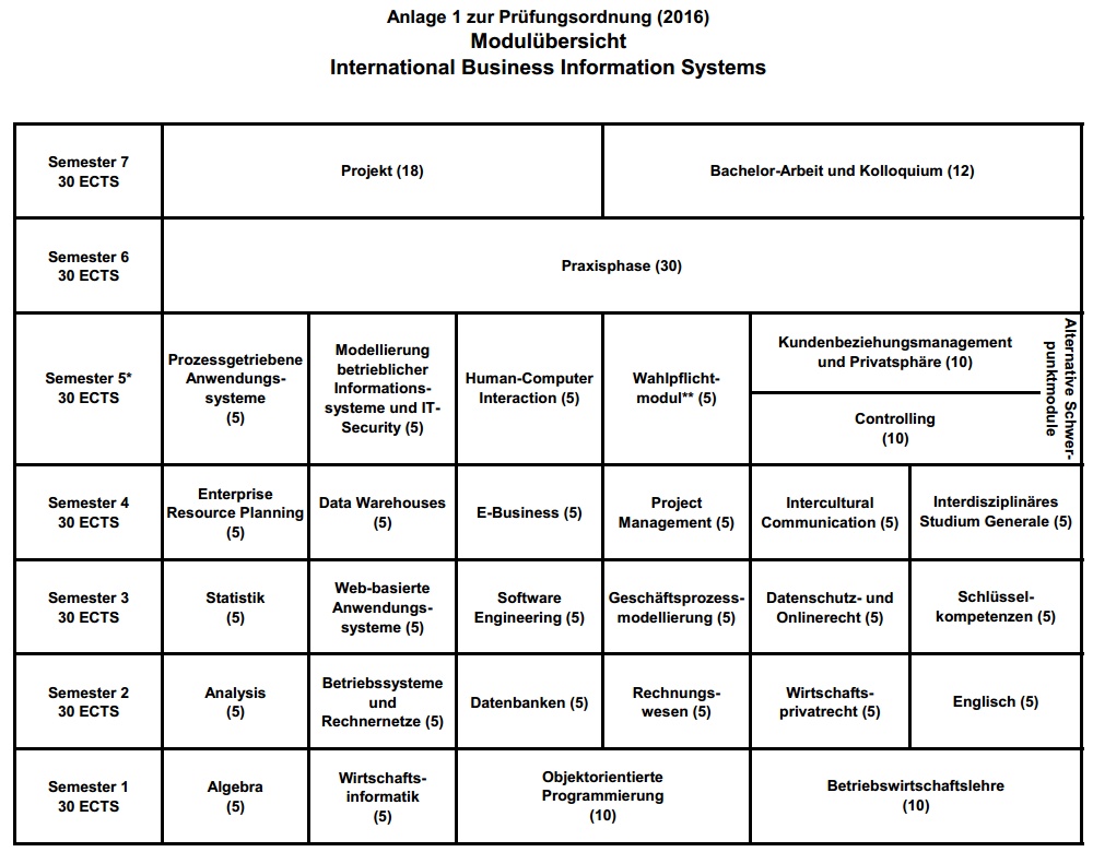 The range of tasks in information system continuously expand due to digitization and networking. Employers expect from graduates of business information systems that they take on tasks which are to be completed in international teams or abroad. In order to meet these demands, Faculty 2 and 3 offer the seven-semester long international bachelor's degree course Business Information Systems (Wirtschaftsinformatik). We are supported by partner universities in Europe, the U.S. and Asia.