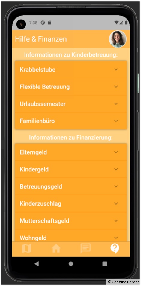 Die Vereinbarkeit von Studium und Familie ist für viele Mütter eine Herausforderung. Dass es schwierig ist, andere Mütter kennenzulernen und eine Betreuung für das Kind zu finden, hat auch Christina Jones erfahren: Die 23-jährige studiert International Finance an der Frankfurt UAS und hat im Jahr 2020 ein Kind zur Welt gebracht. Da sie die einzige studierende Mutter in ihrem Studiengang ist, kam ihr die Idee zur „Go-Mama-App“. Diese soll studierende Mütter an der Hochschule miteinander vernetzen und ihnen alternative Betreuungsmöglichkeiten bieten. Zudem können diese sich mithilfe der App einen leichten Überblick über Fördermöglichkeiten und Hilfestellungen an der Frankfurt UAS verschaffen. „Mir war es wichtig, dass die Mütter in der App ein eigenes Profil anlegen und in einer Kalenderfunktion eintragen können, wann sie eine Betreuung anbieten können. Auch eine Chat-Funktion sollte die App enthalten“, erklärt Jones. Die insgesamt drei Studierenden-Gruppen des Bachelor-Studiengangs Informatik – Mobile Anwendungen setzten die Wünsche der Studentin, die sich teils erst während des Semesters ergaben, um und standen mit ihr im ständigen Kontakt – auf diese Weise konnten Anpassungen während der gesamten Entwicklungszeit vorgenommen werden.