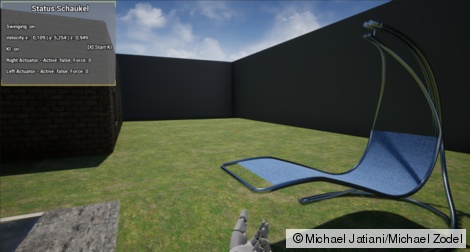 Bereits im Wintersemester 2020/21 haben Studierende des Master-Studiengangs Allgemeine Informatik mit der Entwicklung eines Antriebs für eine Schaukelliege begonnen. Durch Magnetspulen werden Gewichte verlagert, um die Schaukelliege mittels eines Regelkreises, gesteuert durch einen Beschleunigungssensor, zu bewegen. In Zusammenarbeit mit dem gleichen echten Kunden entwickelten die Studierenden nun dafür ein Simulationsmodell mit einer sogenannten Game Engine als Entwicklungsumgebung. „Die Studierenden sollten im Team die Simulation einer ruckelfreien Schaukelbewegung erstellen und visualisieren. Dabei konnten sie die gleichen Sensor- und Bewegungsdaten mit den Daten der echten Schaukel abgleichen, um so die Sensoren und Aktoren realistisch darzustellen“, erklärt Auftraggeber und Alumnus M. Vöhringer. Berücksichtigt wurden bei der Visualisierung auch äußere Einflüsse, welche die regelmäßige Bewegung der Schaukel stören könnten. „Genau hier war es Aufgabe der Studierenden, die Methoden der Künstlichen Intelligenz, kurz KI, an geeigneter Stelle einzusetzen und die Möglichkeiten der Game Engine kennenzulernen“, ergänzt Liebehenschel. Beide Gruppen verfolgten hierbei Ansätze mit unterschiedlichen Game Engines (Unity und Unreal Engine). Eine Gruppe nutzte einen herkömmlichen Ansatz zur Bewegung der Schaukel, die andere maschinelles Lernen, eine Methode aus dem Bereich der KI.